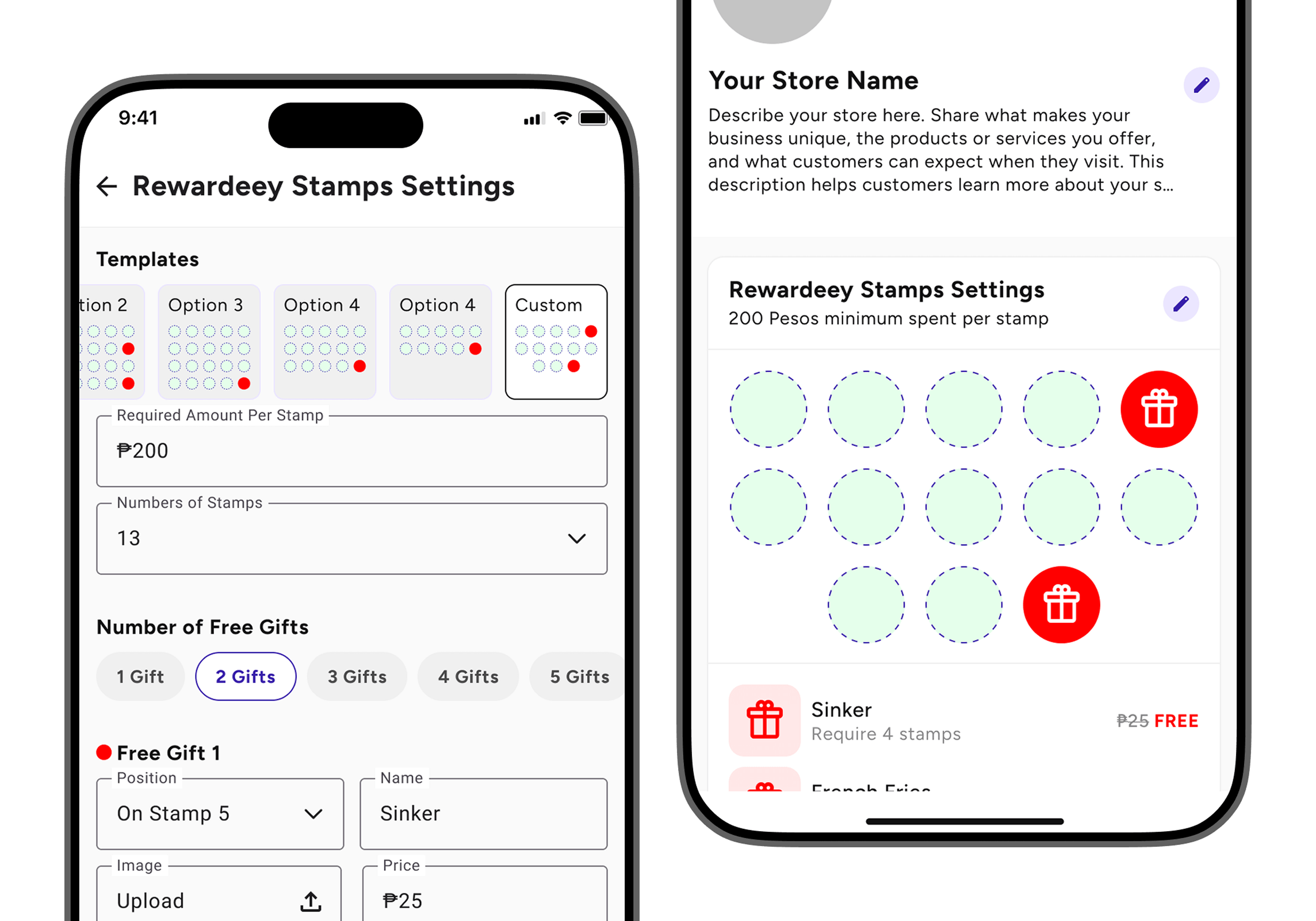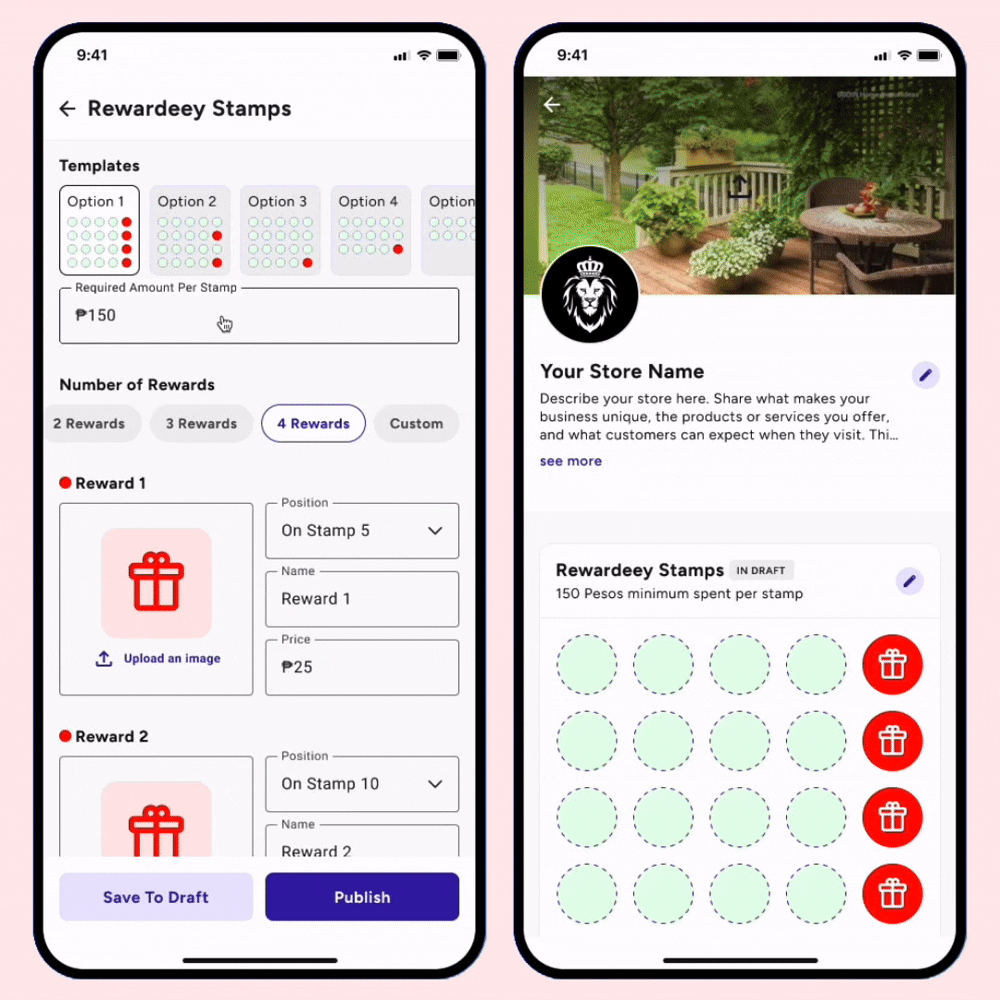Choose how many stamps you need, set the amount per stamp, add reward details, and publish.